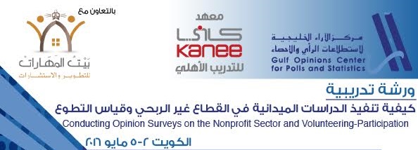 مركز الآراء الخليجية لاستطلاعات الرأي / الكويت مركز بيت المهارات للتطوير والاستشارات في جامعة الملك عبد العزيز / السعودية “” الورشةالتدريبية الخاصة بتنفيذ الدراسات الميدانية في القطاع غير الربحي وقياس التطوع “” الكويت خلال الفترة ما بين 2-5 مايو 2016 يقدمها كلاً من : الخبير العالمي في مجال ابحاث وإستطلاعات الراي بالقطاع غير الربحي د. ديفيد سميث David Smith مؤسس منظمة …
