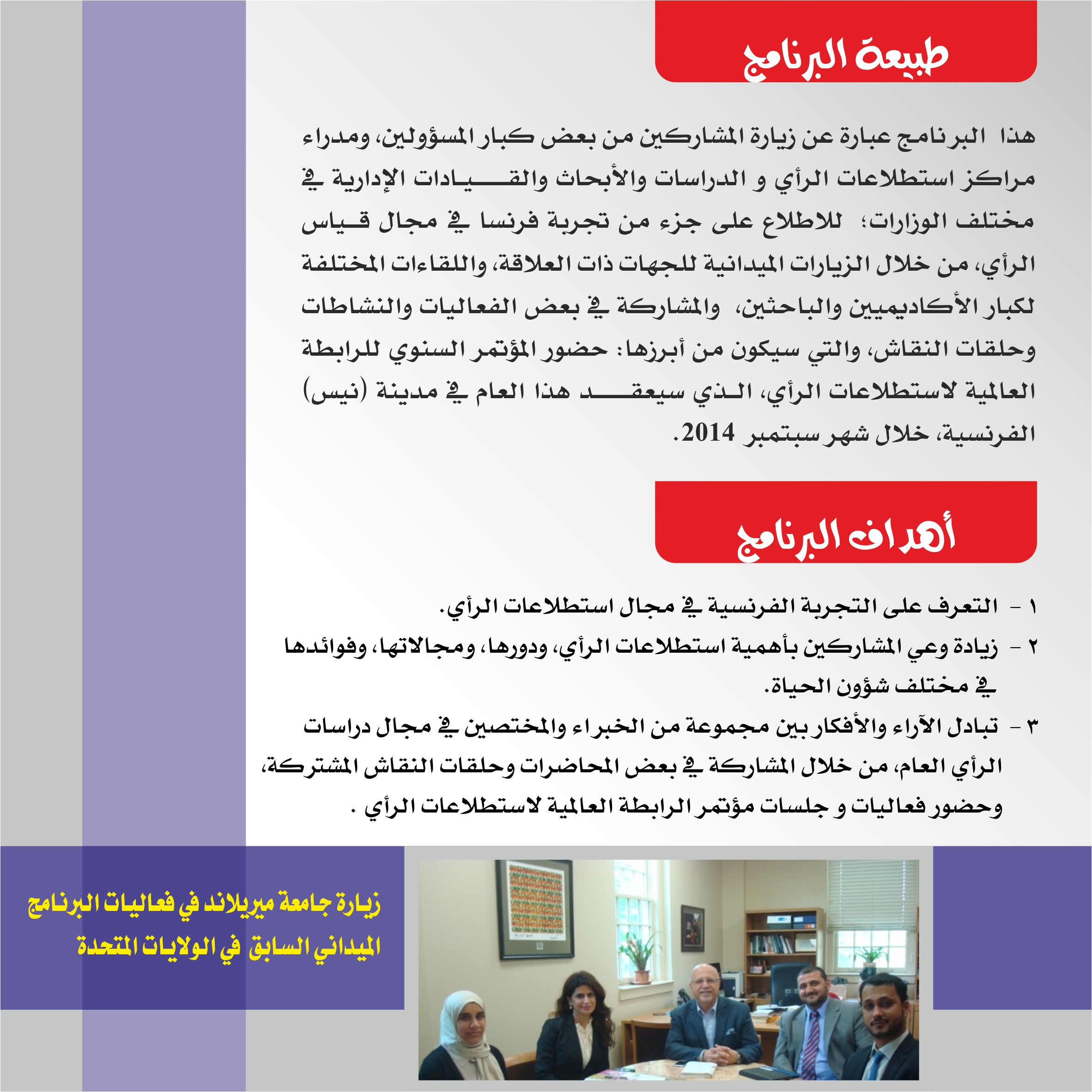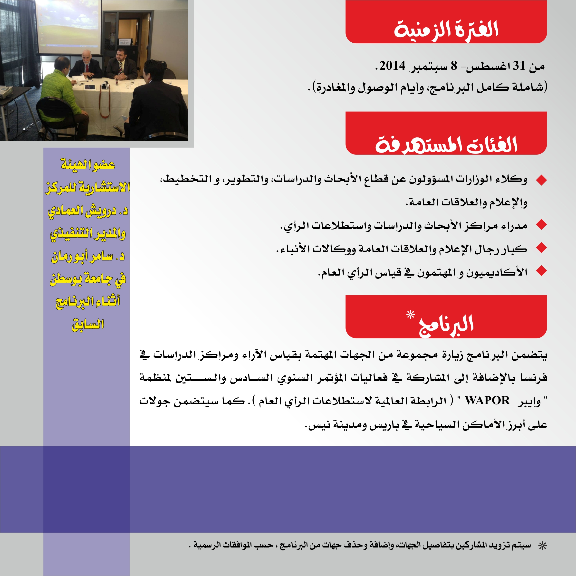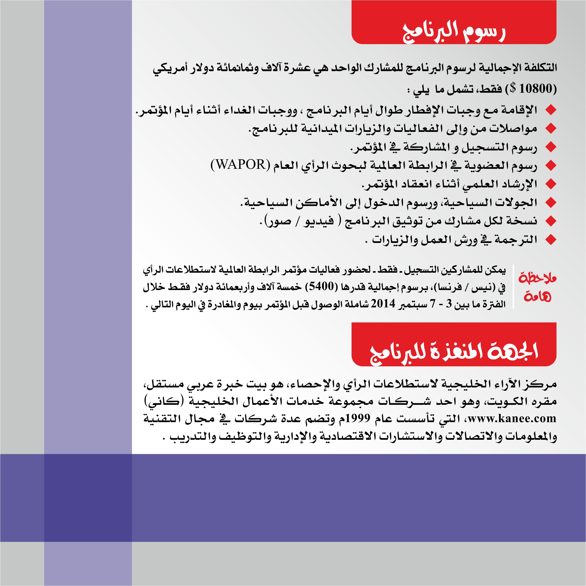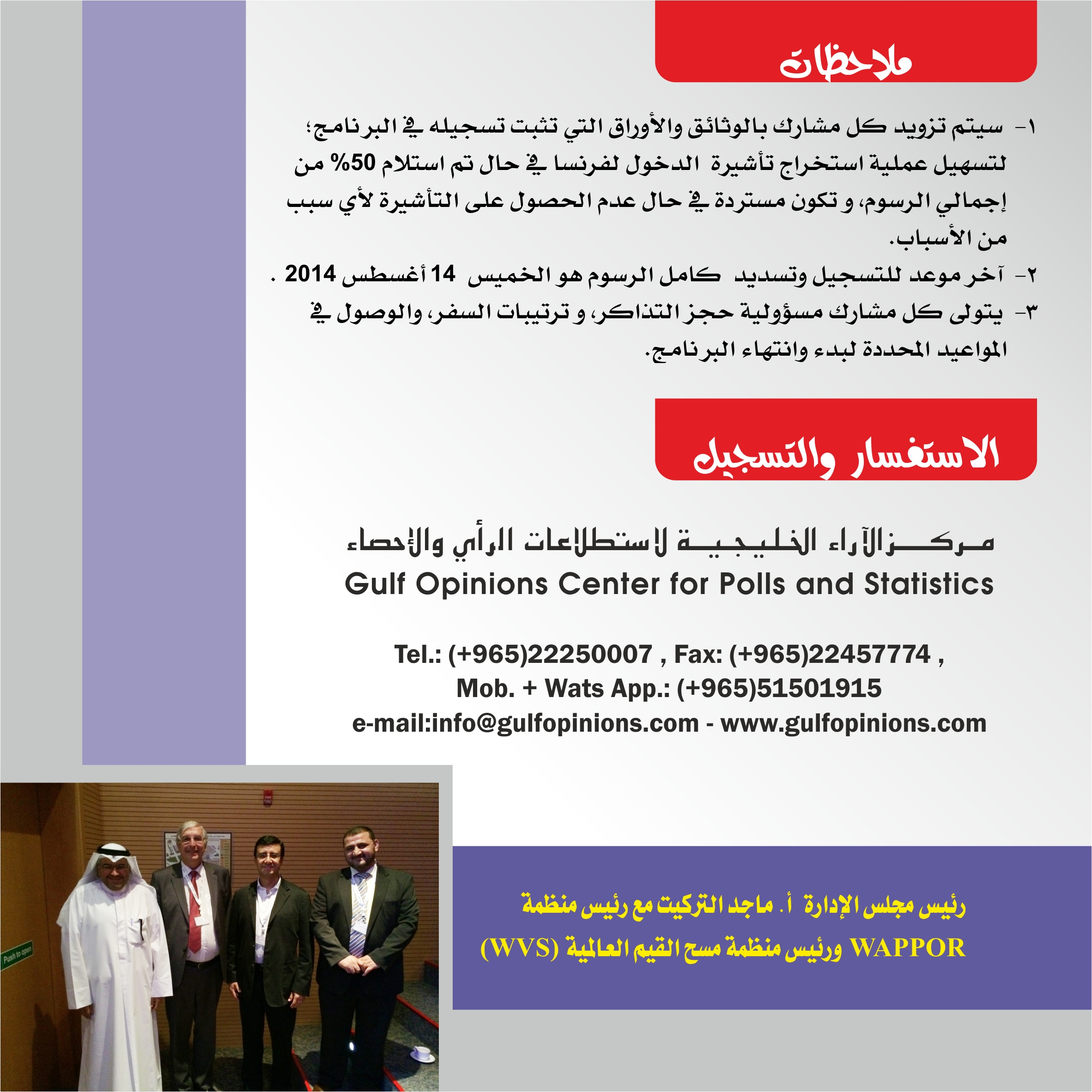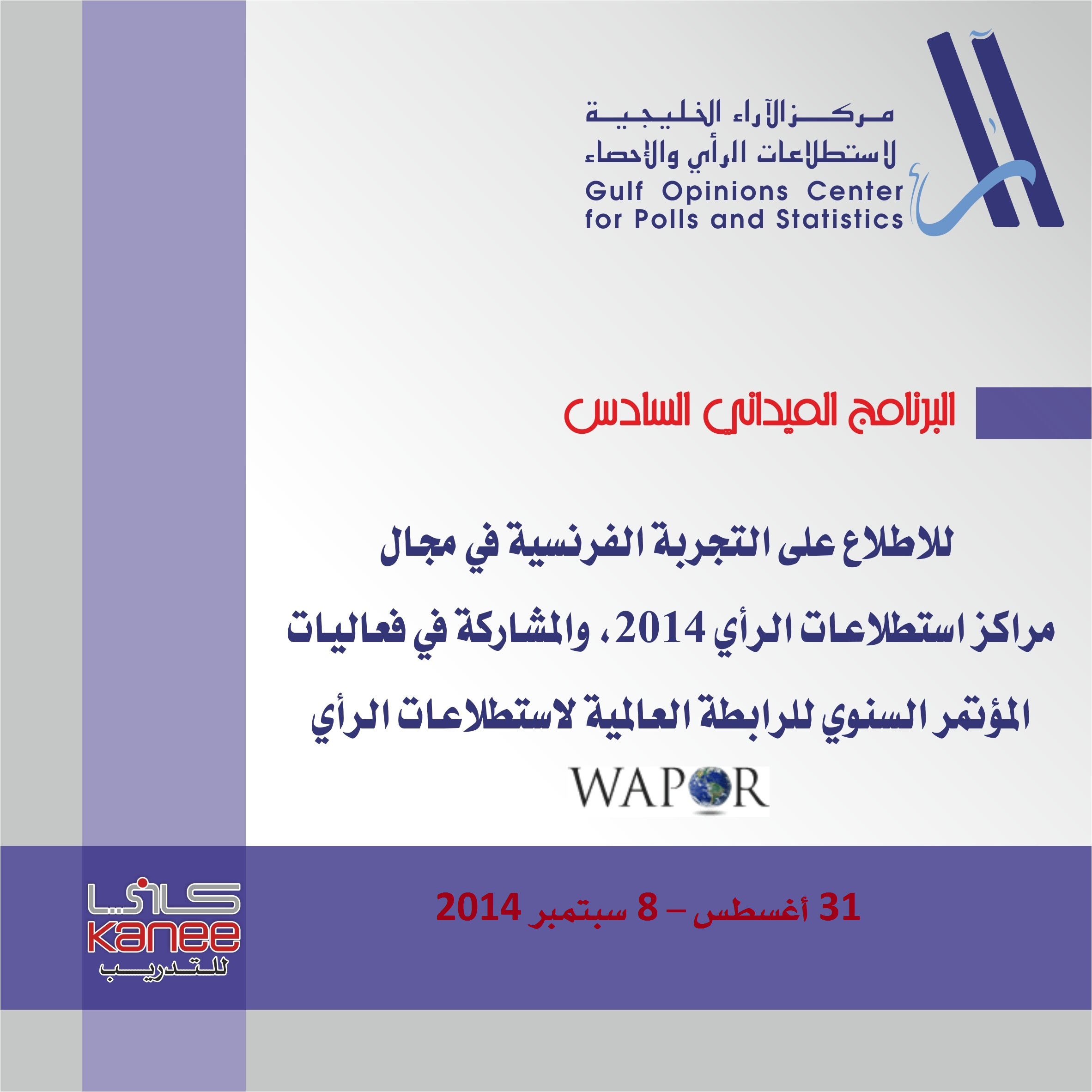 ضمن خطته التدريبية لعام 2014 يعلن مركز الآراء الخليجية عن بدء التسجيل في برنامجه الميداني السادس للاطلاع على التجربة الفرنسية في مجال استطلاعات الرأي، والمشاركة في فعاليات المؤتمر السنوي للرابطة العالمية لاستطلاعات الرأي WAPOR، خلال الفترة ما بين 31 أغسطس و 8 سبتمبر 2014.