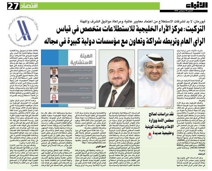 نشرت صحيفة الأنباء الكويتية مقابلة هامة مع رئيس مجلس ادارة مركز الآراء الخليجية الاستاذ ماجد عبد الله التركيت، والمدير التنفيذي للمركز د. سامر رضوان أبو رمان، تناولت عرض لأبرز مشاريع المركز و واقع دراسات السوق واستطلاعات الرأي في الكويت، وفيما يلي النص الكامل للمقابلة :