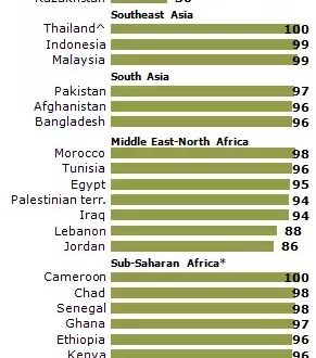 وفي استطلاع آخر أجراه نفس المركز، والذي تم على أكثر من 38000 مسلم في جميع أنحاء العالم على مستوى 39 دولة، تم السؤال عن العبادات التي يقومون بها ويواظبون عليها خلال شهر رمضان، وقد اتضح أن (63 ٪) من المسلمين (المشمولين بالعينة) يؤدون الصلوات الخمس بانتظام في اليوم خلال شهر رمضان، كما أن (77 ٪) من المسلمين في تلك الدول يُقدِّمون الزكاة في هذا الشهر الكريم، وتصل تلك النسبة إلى (93 ٪) من المسلمين في جنوب شرق آسيا، وإلى (89 ٪) في جنوب آسيا، ولوحظ أن النسبة تقل في الشرق الأوسط وشمال إفريقيا لتصل إلى (79 ٪)، وتصل إلى (77 ٪) في جنوب الصحراء الكبرى، أما أصغر نسبة فكانت في آسيا الوسطى بواقع (69 ٪)، وفي جنوب وشرق أوروبا وصلت إلى( (56 ٪.